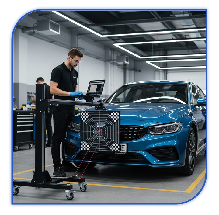 Effectué directement sur route : les capteurs et caméras sont reprogrammés en conditions réelles de conduite pour garantir un fonctionnement parfait.